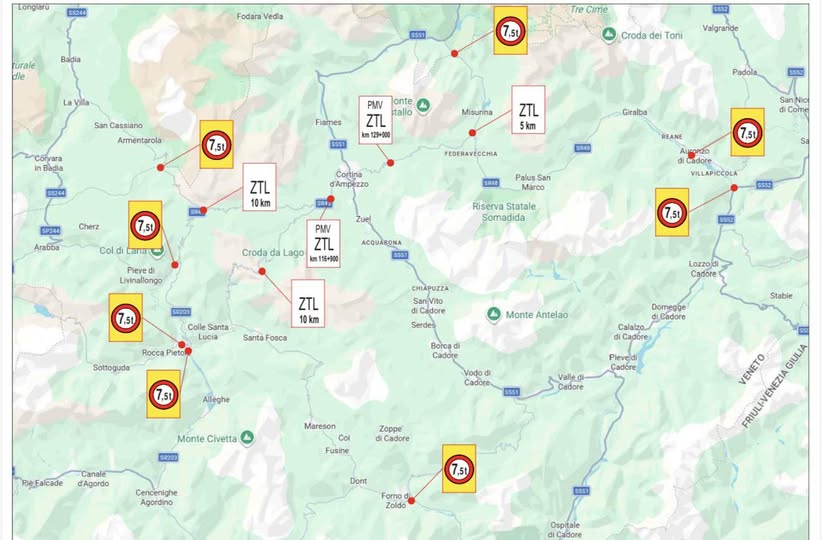 Cimabanche – confine provincia) – salvo autorizzazione carico/scarico presso le attività lungo la strada dal Km 105+650 fino al Km 107+050 e Villaggio Olimpico di Fiames